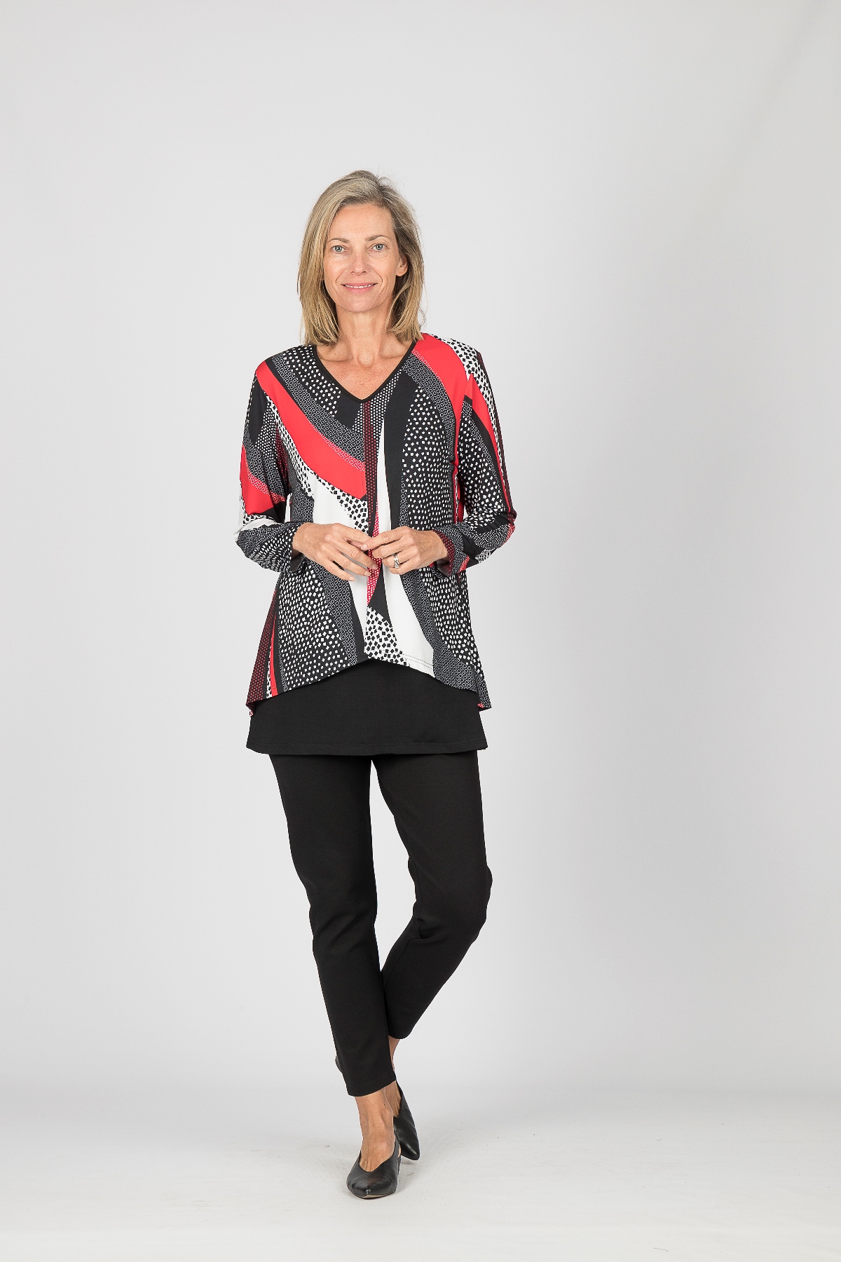 Abstract design with V-neck and insert open pleat front and back